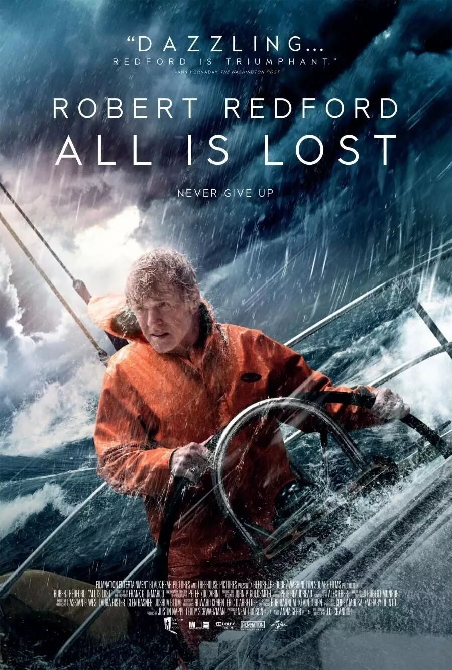 然后整个过程中,只有一个演员,一句台词,一段沉默的海难漂流,一段生与死的搏斗!看着80岁高龄的演员罗伯特·雷德福的演绎,心中莫明的一种感动。