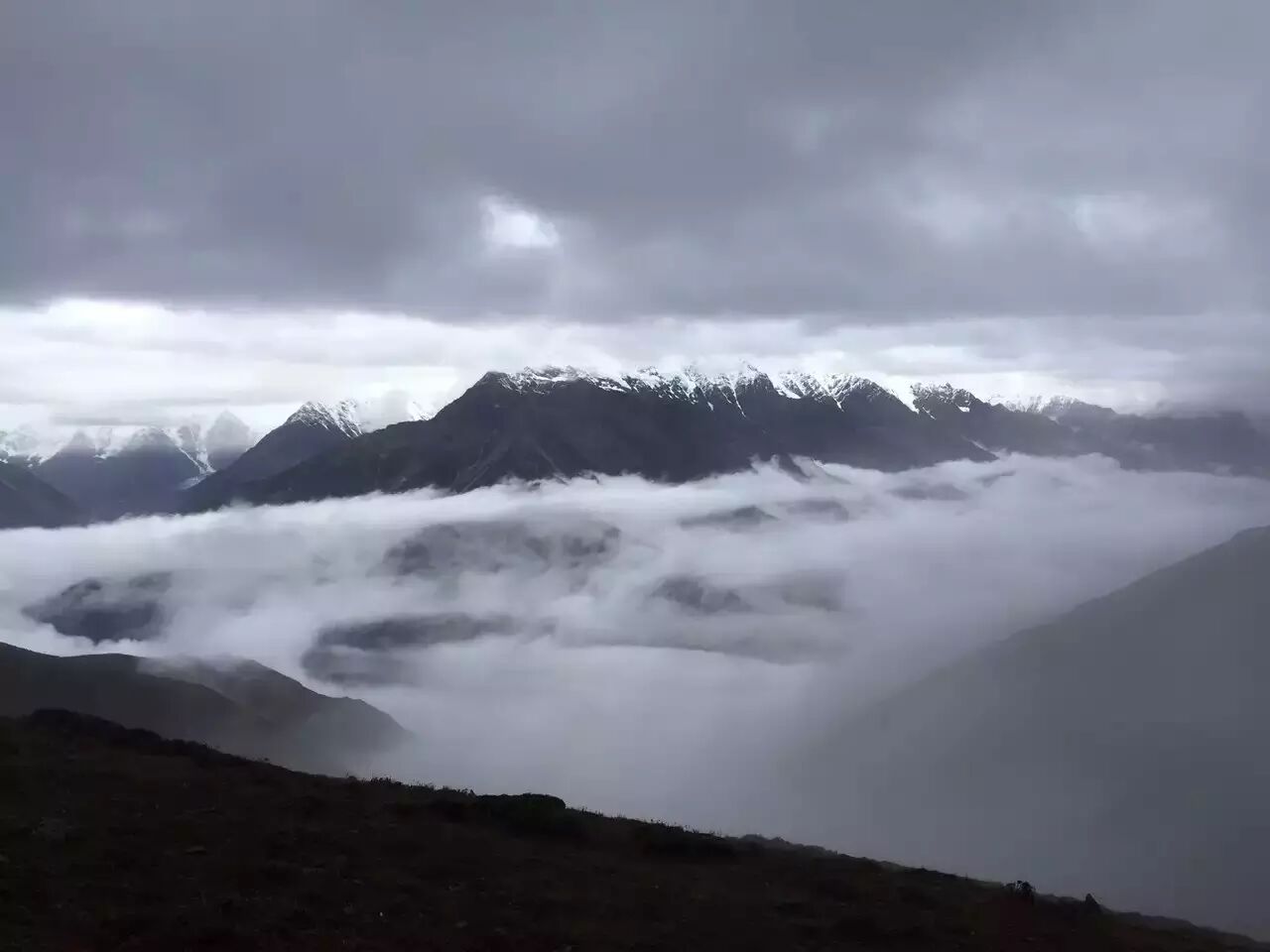 天气原因,尽管9个小时的艰难徒步,贡嘎山并没有因此而愿意露出它的真容。惟一雨雾散开的时间,是当晚七点多的时间,云海浮现!